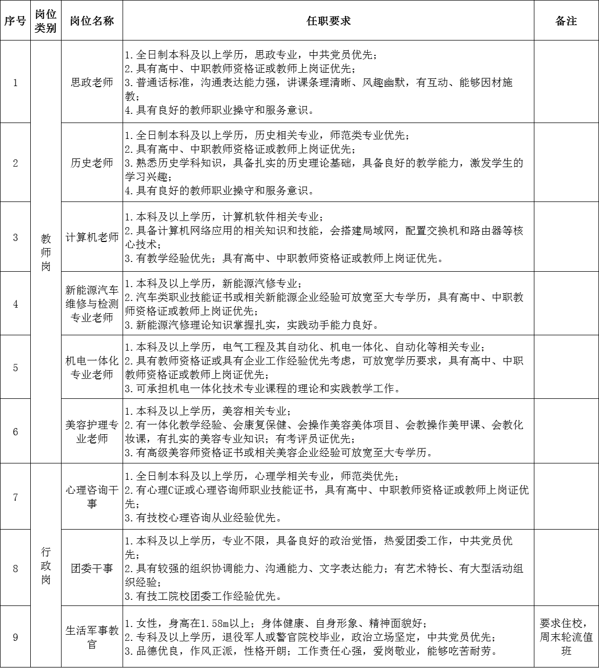 4、教師崗需本科及以上學(xué)歷,碩士?jī)?yōu)先;文化課教師需持有相應(yīng)的教資;專業(yè)課教師持有相應(yīng)技能證書/職稱或相應(yīng)行業(yè)經(jīng)驗(yàn)優(yōu)先錄用。