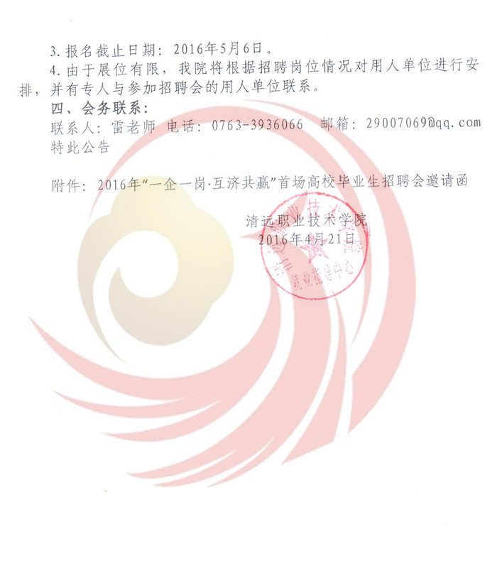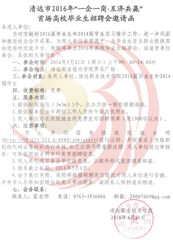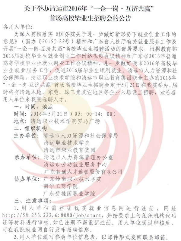 為深入貫徹落實(shí)《國(guó)務(wù)院關(guān)于進(jìn)一步做好新形勢(shì)下就業(yè)創(chuàng)業(yè)工作的意見(jiàn)》(國(guó)辦﹝201523號(hào))精神和廣東省人社廳有關(guān)就業(yè)服務(wù)工作及開(kāi)展“一企一崗▪互濟(jì)共贏”高校畢業(yè)生找屁活動(dòng)的部署要求,根據(jù)教育部2016屆高校畢業(yè)生就業(yè)創(chuàng)業(yè)工作網(wǎng)絡(luò)視頻會(huì)議精神和廣東省2016年普通高等學(xué)校畢業(yè)生就業(yè)創(chuàng)業(yè)工作會(huì)議精神,進(jìn)一步做好我市2016年高校畢業(yè)生就業(yè)服務(wù)工作,促進(jìn)2016屆畢業(yè)生順利就業(yè)。清遠(yuǎn)市人力資源四川和社會(huì)保障局,清遠(yuǎn)市職業(yè)技術(shù)學(xué)院和清遠(yuǎn)市職業(yè)教育集團(tuán)聯(lián)合主辦的2016年“一企一崗▪互濟(jì)共贏”首場(chǎng)高校畢業(yè)生招聘會(huì)定于521日在清遠(yuǎn)市職業(yè)技術(shù)學(xué)院舉辦,屆時(shí)將有清遠(yuǎn)本地、東莞、珠三角其他地區(qū)等企業(yè)入場(chǎng)設(shè)點(diǎn)招聘,歡迎各用人單位到清遠(yuǎn)市職業(yè)技術(shù)學(xué)院選聘人才。